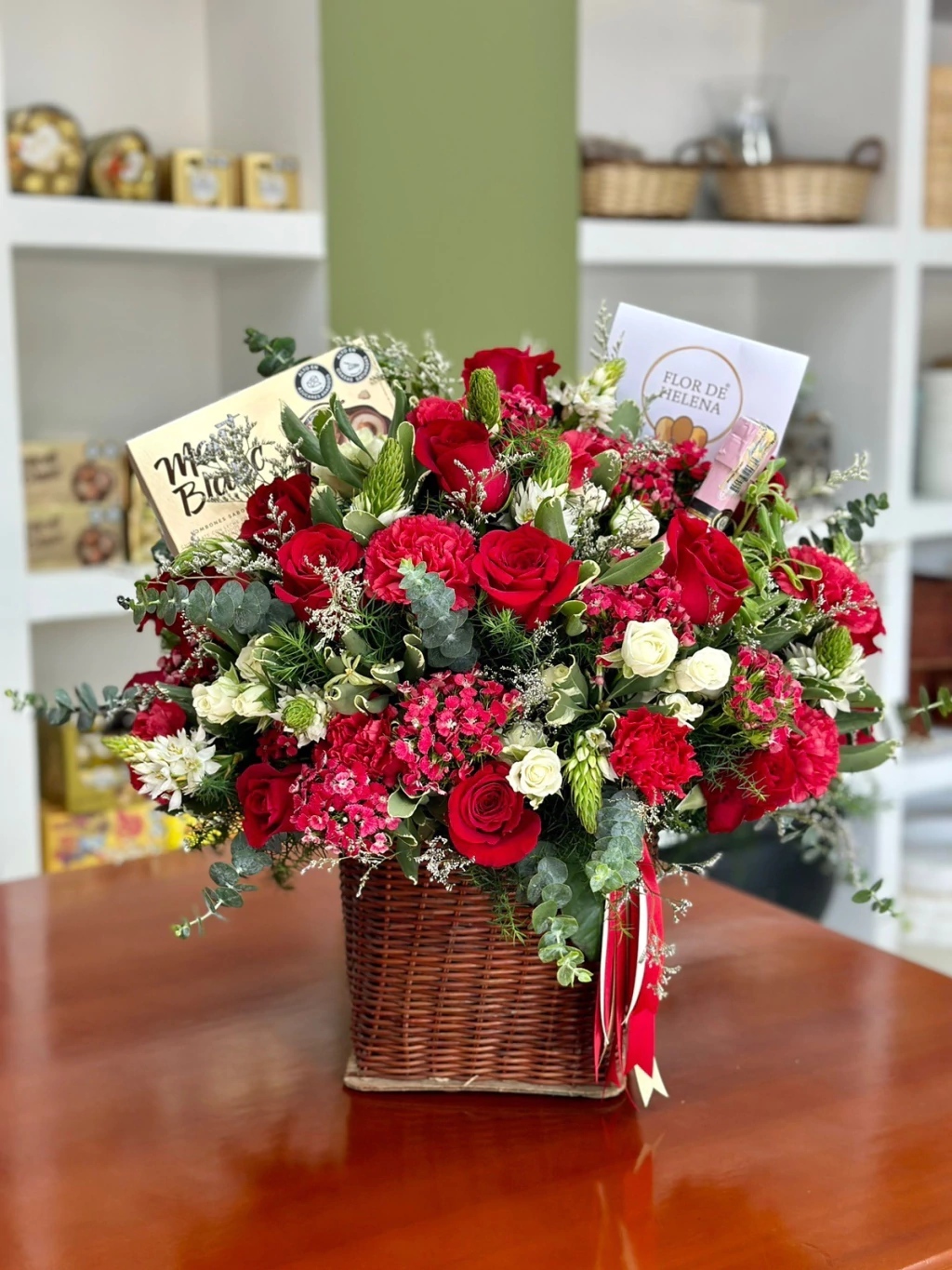 Exprese sus sentimientos con un hermoso diseño floral frutal elaborado por Flor de Helena, con rosas frescas, eucalipto baby, rusco, helecho cuero, mini rosas, caspia, clavel chino, en un canasto especial para flores artesanal.