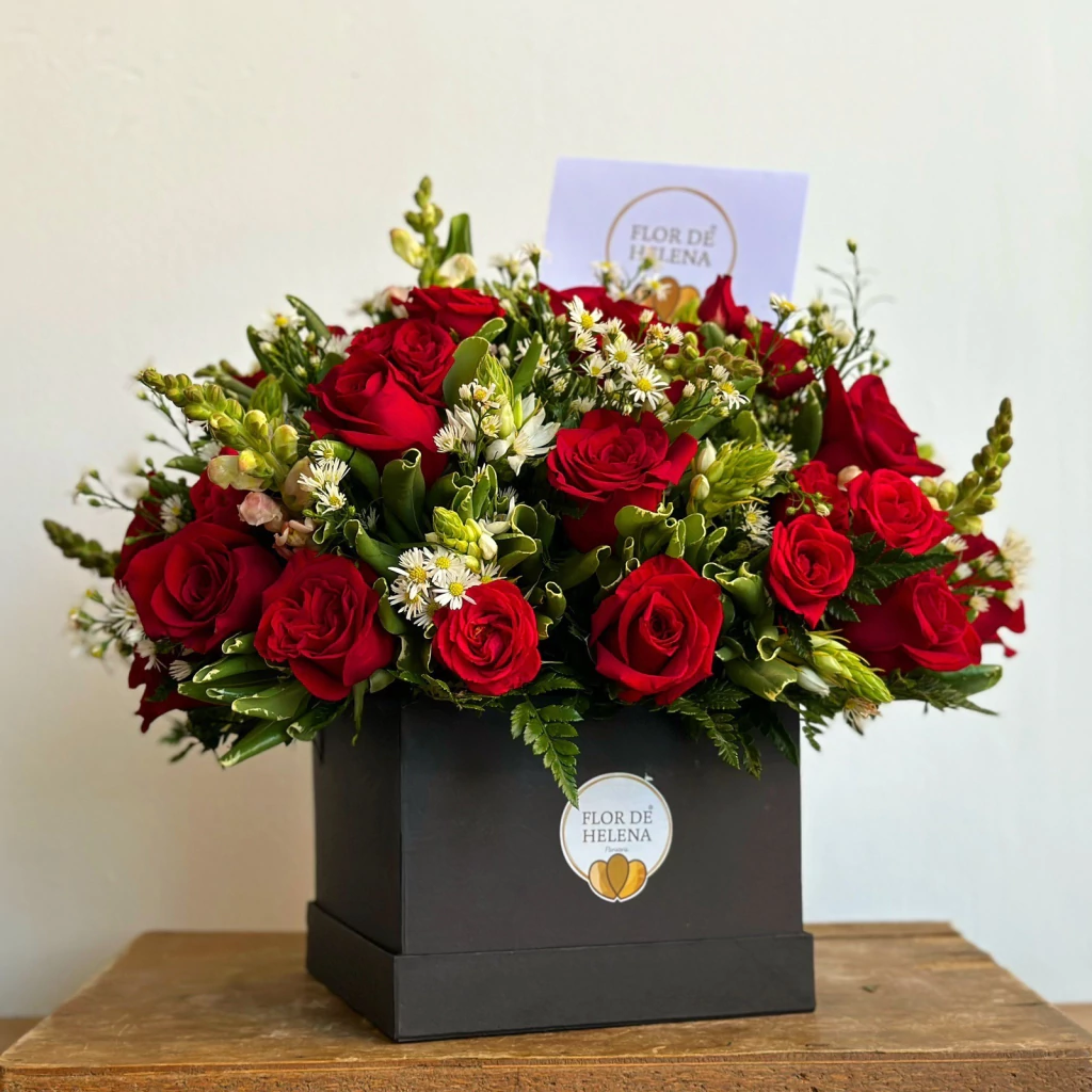 Exprese sus sentimientos con un hermoso diseño floral elaborado por Flor de Helena, con rosas frescas, mini rosas, fitusesporium, snack dragón, estrella de Belem, Aster blanco, en una caja especial para flores.