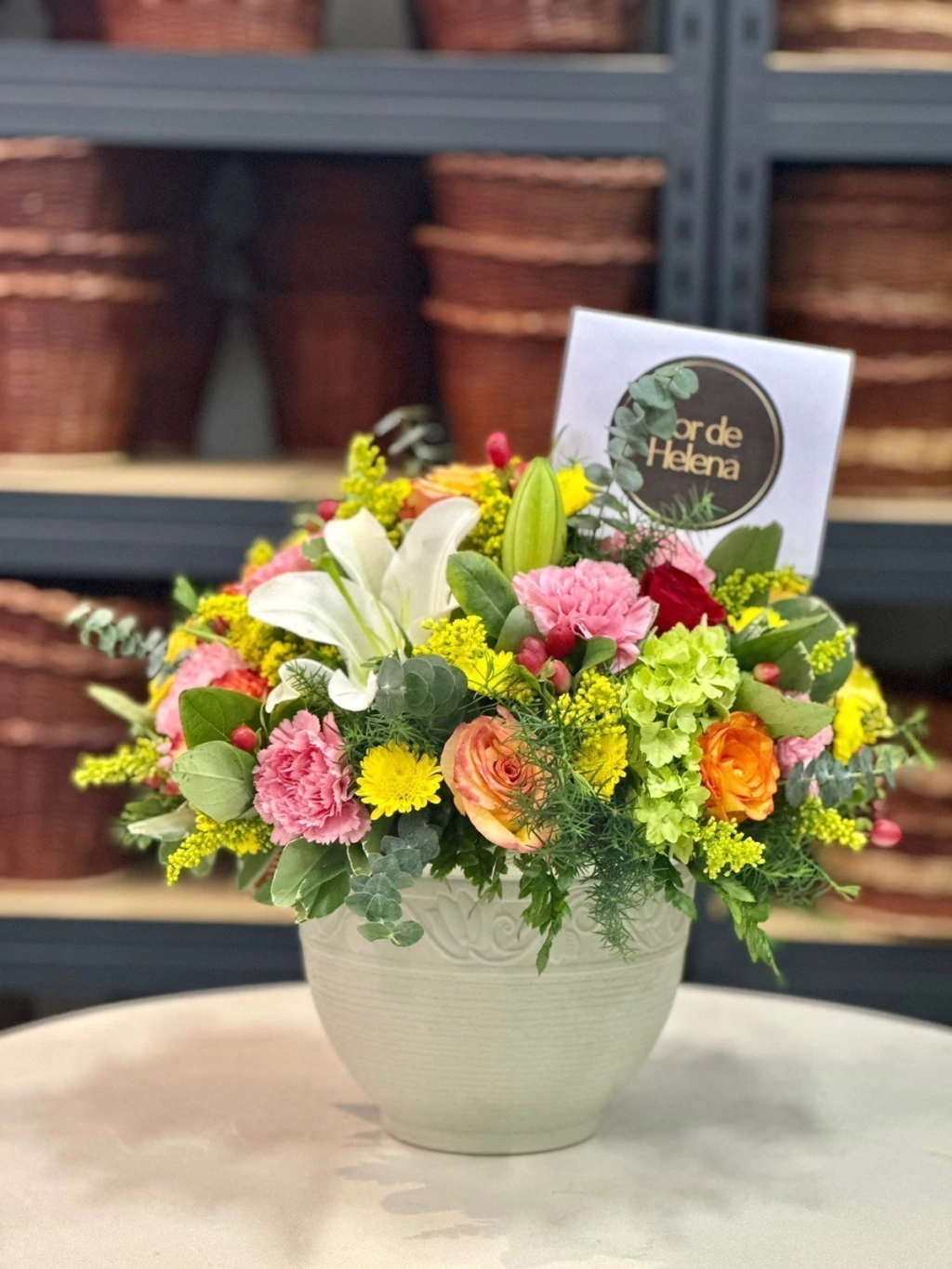 Expresa tus sentimientos con un hermoso diseño floral, elaborado por Flor de Helena con rosas, mini rosas, hortensias, lirios, pinopios, solidago, eucalipto baby, aster, pino venezolano, helecho cuero, estrella de belén, en una base especial para flores.