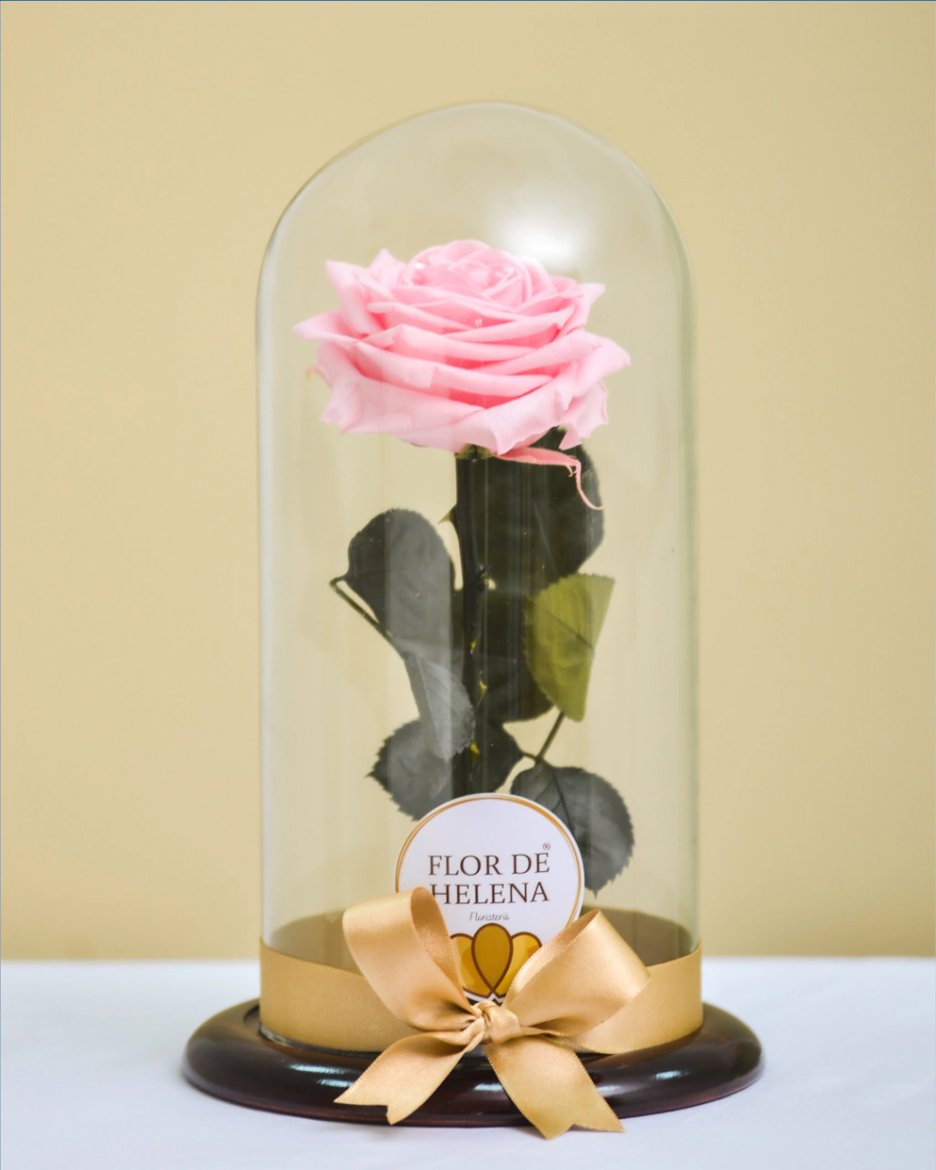 Rosa preservada en una urna de cristal especial para una mayor conservación y durabilidad con una altura aproximada de 30cm. La rosa preservada no requiere agua y con un excelente cuidado puede durar más de dos años.